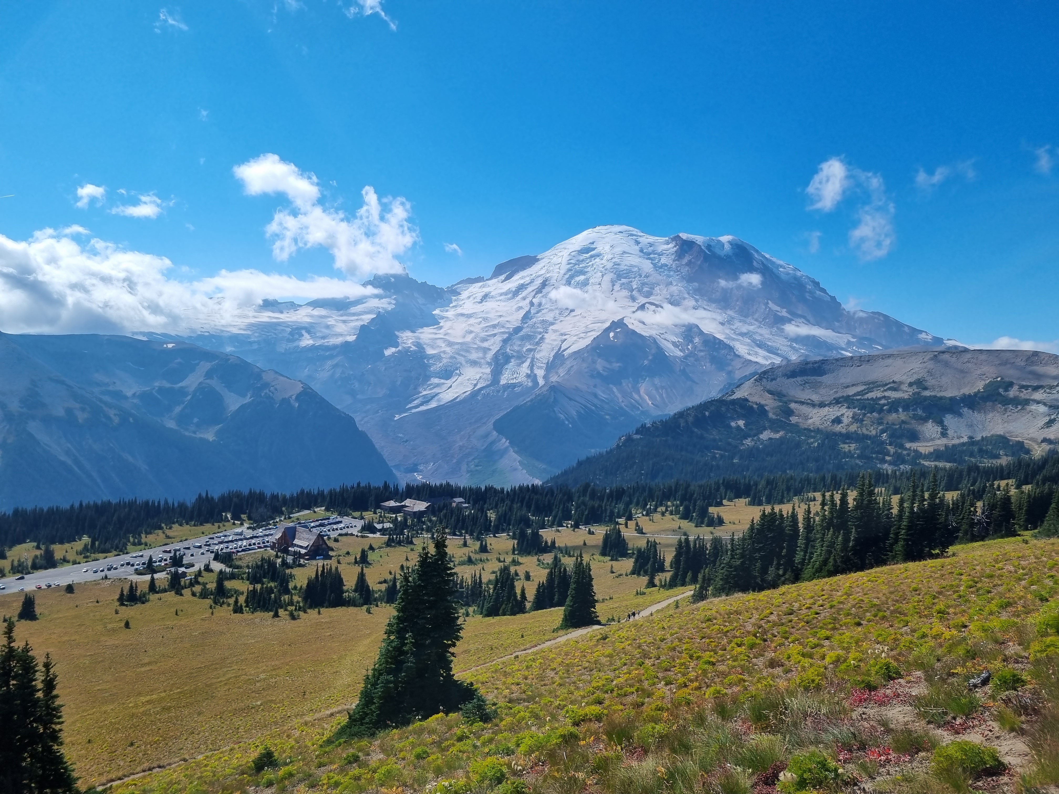 On our final day, we picked up a rental car from Seattle-Tacoma Airport early in the morning and drove to Mount Rainier National Park, which is about a 1 hour and 40-minute car ride away. The park is home to the majestic Mount Rainier, an active volcano surrounded by old-growth forests, wildflowers, five major rivers, and glaciers. Visitors can enjoy activities such as hiking, camping, wildlife viewing, including bears, deer, and mountain goats, and winter sports. Mount Rainier is divided into several areas, each offering unique landscapes. The two most famous ones are Paradise, known for its wildflower meadows and stunning views of the volcano, and Sunrise, the highest point in the park accessible by car, offering breathtaking sceneries of the surrounding mountains. Visitors can also explore the Ohanapecosh area with its lush forests and beautiful river, the Longmire area for the park’s museum, historic buildings, and nature trails, and the Carbon and Mowich area known for its lush rainforest environment and the Carbon River. During our visit, we decided to explore the Sunrise and Paradise areas.