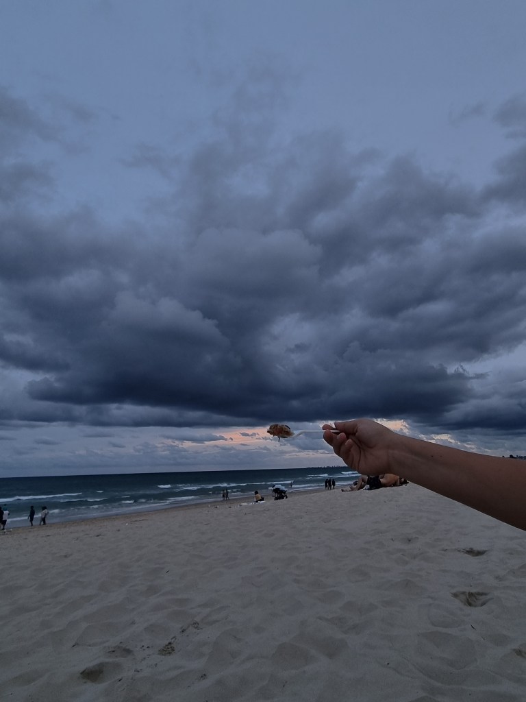 Later in the afternoon, after saying goodbye to our friend, we returned to the heart of the Gold Coast. We wandered through the lively streets, soaking in the vibrant atmosphere, before deciding to grab dinner. We found a perfect spot on the beach, sitting by the shore as the waves rolled in while the sun was setting.