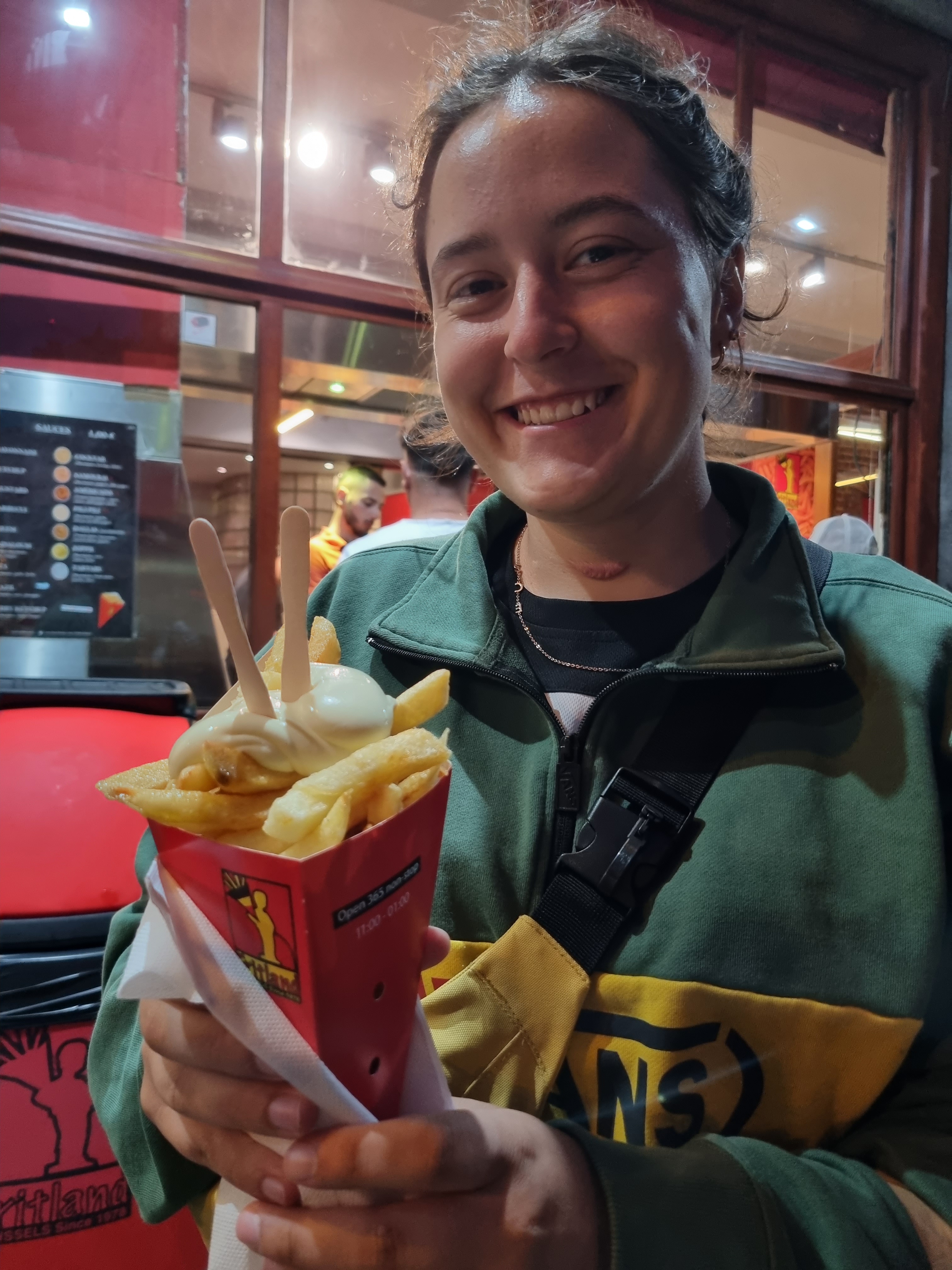As the afternoon turned into evening, we wandered through the cobblestone streets, immersing ourselves in the essence of Brussels. The air was filled with a delightful mix of aromas — perfectly golden and crispy Belgian fries and freshly baked waffles. No trip here would be complete without indulging in a cone of those famous fries, served with one of their signature sauces. For dessert, we couldn’t resist the call of the waffles we’d been smelling all day. Afterwards, we eventually made our way back to our accommodation.